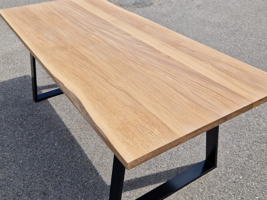 Detta matbord är byggt i vårt snickeri i Nynäshamn, med material från närområdet. Skivan är gjord av massiv ek som vuxit lokalt och sågats i vårt eget sågverk. Underredet består av stålben som ger stabilitet och enkel design.